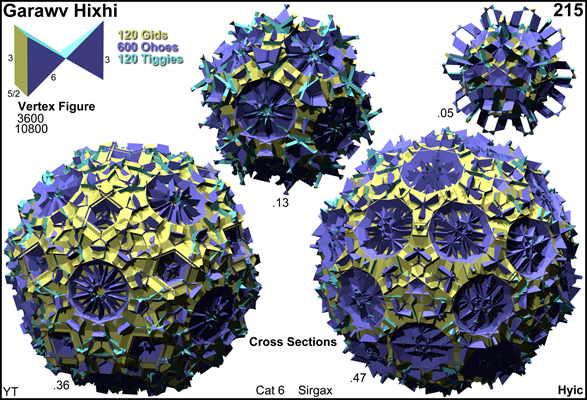 o5/2x3x3/2o3*b . . . . | 3600 | 4 2 | 2 4 2 1 | 2 1 2 ---------------+------+-----------+---------------------+------------ . x . . | 2 | 7200 * | 1 1 1 0 | 1 1 1 . . x . | 2 | * 3600 | 0 2 0 1 | 1 0 2 ---------------+------+-----------+---------------------+------------ o5/2x . . | 5 | 5 0 | 1440 * * * | 1 1 0 . x3x . | 6 | 3 3 | * 2400 * * | 1 0 1 . x . o3*b | 3 | 3 0 | * * 2400 * | 0 1 1 . . x3/2o | 3 | 0 3 | * * * 1200 | 0 0 2 ---------------+------+-----------+---------------------+------------ o5/2x3x . ♦ 60 | 60 30 | 12 20 0 0 | 120 * * o5/2x . o3*b ♦ 30 | 60 0 | 12 0 20 0 | * 120 * . x3x3/2o3*b ♦ 12 | 12 12 | 0 4 4 4 | * * 600