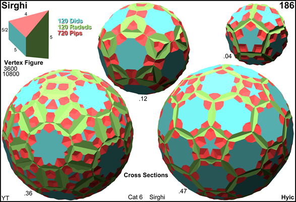 x5o5/2x5o . . . . | 3600 | 2 4 | 1 4 2 2 | 2 2 1 ----------+------+-----------+--------------------+------------ x . . . | 2 | 3600 * | 1 2 0 0 | 2 1 0 . . x . | 2 | * 7200 | 0 1 1 1 | 1 1 1 ----------+------+-----------+--------------------+------------ x5o . . | 5 | 5 0 | 720 * * * | 2 0 0 x . x . | 4 | 2 2 | * 3600 * * | 1 1 0 . o5/2x . | 5 | 0 5 | * * 1440 * | 1 0 1 . . x5o | 5 | 0 5 | * * * 1440 | 0 1 1 ----------+------+-----------+--------------------+------------ x5o5/2x . ♦ 60 | 60 60 | 12 30 12 0 | 120 * * x . x5o ♦ 10 | 5 10 | 0 5 0 2 | * 720 * . o5/2x5o ♦ 30 | 0 60 | 0 0 12 12 | * * 120 snubbed forms: β5o5/2x5o