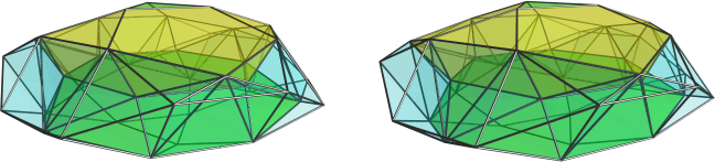 Essentially, for making this structure convex, are these pyramid pairs: In fact it is the part of the lace city, which is Fo3oF&#f, which would feature f-edges, if those wheren't contained within these pentagons. This too requires is what requires the symbols x3F and F3x in the lace city, as those would be the positions of the pentagon vertices opposite to their head vertex at the x3x position. – It might be possible to blend at these pyramid pairs a line || perp {5} each. Then it not even would be required to surmount the opposite positions by x3F and F3x, but one might remain with those subsymbols of ex, i.e. with o3f and f3o instead. The left half, say, of the lace city then would lead directly to dim. thawro-wedged 1/6-luna of ex. But unfortunately that one would not be convex any more, as its hull would feature right those above mentioned f-edges.