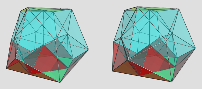 It shall be noted here that just this alternating tetra-augmentation remains convex. Neighbouring teddies well can be augmented, but neither the dihedral angle at the pentagon then would remain convex (as for tetu), nor the cavity could be bridged by further unit edges (as for the iku).