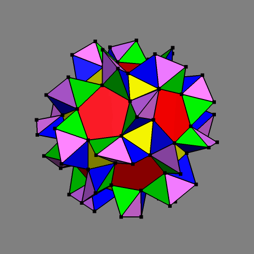 Going beyond the final point (B) of snubbed polyhedra instead would become more interesting. Here there would come a point (C), where the deformed original squares will degenerate to nothing. This would be the case when the triangles are rotated about 60 degrees or alternatively the pentagrams are rotated about 72 degrees. Drilling even further, the net polygons P and Q would start to intersect and the holes between those become retrograd.