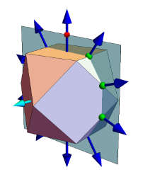 The second pic shows the cyan 5-fold rotational axis on a single co component and the respective orthogonal rotation plane. Note that the green edge intersection centers together with the red square normal provide 10 equiangular directions. (An according proof eg. is provided in that appendix.)