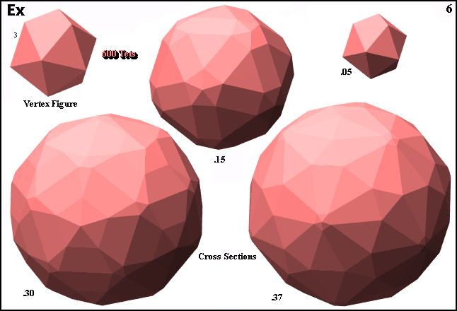 Diminishing ex at the vertex positions of an inscribed f-ico results in sadi. – Diminishing likewise at the vertex positions of 2 inscribed f-icoes, which mutually are not vertex incident, results in bidex. – Double-diminishing ex at the vertex positions of an inscribed f/q-hex, i.e. chopping off (intersecting) bistratic caps, results in f-tes. – Diminishing likewise at the vertex positions of an inscribed f-spid results in idimex.