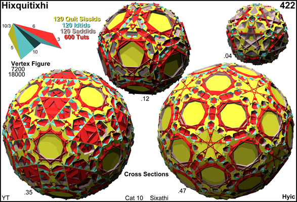 As abstract polytope hixquitixhi is isomorphic to hixtixhi, thereby replacing pentagons by pentagrams and interchanging the roles of the decagons and decagrams, respectively replacing saddid by gaddid and quit sissid by tigid. – As such hixquitixhi is a lieutenant.