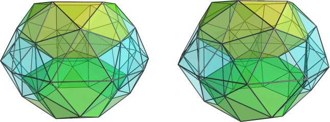 Essentially, for making this structure convex, are these pyramid pairs: In fact it is the part of the lace city, which is Fo3oF&#f, which would feature f-edges, if those wheren't contained within these pentagons. This too requires is what requires the symbols x3F and F3x in the lace city, as those would be the positions of the pentagon vertices opposite to their head vertex at the x3x position. – It might be possible to blend at these pyramid pairs a line || perp {5} each. Then it not even would be required to surmount the opposite positions by x3F and F3x, but one might remain with those subsymbols of ex, i.e. with o3f and f3o instead. The left half, say, of the lace city then would lead directly to dim. thawro-wedged 1/6-luna of ex. But unfortunately that one would not be convex any more, as its hull would feature right those above mentioned f-edges.