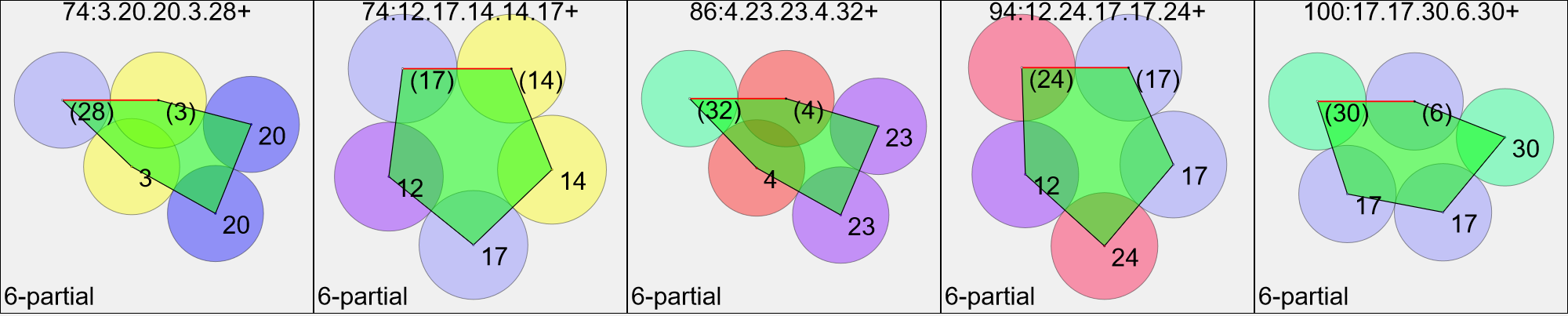 Strictly Convex PolytilesEnumerationThis table shows the enumeration of strictly-convex p-tiles, by sides with a brute-force search. Chiral pairs are counted as 1. Digon are excluded. The highest-sided strictly convex p-tile is a regular p-gon. Identical polygons can repeat between p-tile families as multiplies. For instance, a square is the tetratile 1^4 and octatile 2^4, and dodecatile 3^4, etc. You can see the counts generally increase exponentially, but not always consecutively. For instance there are more 24-tiles than 26-tiles, and more 30-tiles than 32 tiles.